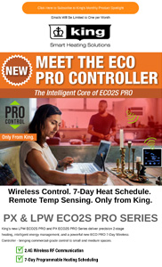 Monthly Product Spotlight Spotlight: KBP Series2 Pic-A-Watt Unit Heater. Built on a Legacy of Decades of Trust Product Spotlight, 11/03/2025 Spotlight: The Ultimate Wet Location Rated Freeze Protection Heater Product Spotlight, 10/02/2025 Spotlight: Extreme Cold? No Problem. KBP-RCS Starts Where Others Stall. Product Spotlight, 9/01/2025 Spotlight: Upgrade to a Heat Pump without Ditching Your Existing Electric Heaters Product Spotlight, 08/04/2025 Spotlight: How to Cool Industrial Spaces w/King High Velocity Fans Product Spotlight, 07/07/2025 Spotlight: Elevate Unoccupied Room Temperatures to 160F Product Spotlight, 06/02/2025 Spotlight: Freeze Protection Heaters in UnOccupied & Concealed Spaces Product Spotlight, 05/05/2025 Spotlight: Snowmelt Cables & Mats Product Spotlight, 04/07/2025 Spotlight: Spring Into Comfort This Season Product Spotlight, 03/03/2025 Spotlight: Comprehensive Electric Heating Solutions for Industrial Space Product Spotlight, 02/03/2025 Spotlight: Comprehensive Electric Heating Solutions for Every Space Product Spotlight, 12/02/2024 Spotlight: Electric Heating Solutions for Modern Agriculture Product Spotlight, 11/04/2024 Spotlight: Why Use Hydronic In-Wall Heaters? Product Spotlight, 10/07/2024 Spotlight: 5 Top Tips for Winter Product Spotlight, 9/09/2024 Spotlight: SR Heating Cable Product Spotlight, 8/05/2024 Spotlight: Stainless Steel Heaters Product Spotlight, 7/01/2024 Spotlight: High Velocity Fans Product Spotlight, 6/03/2024 Spotlight: Property Management Thermostats Product Spotlight, 5/06/2024 Spotlight: Introducing SafeTouch Heaters Product Spotlight, 3/04/2024 Spotlight: SmartWave Outdoor Heating Product Spotlight, 2/05/2024 Spotlight: Industrial Portable Heaters Product Spotlight, 1/01/2024 Spotlight: Big Heat For Large Spaces Product Spotlight, 12/01/2023 Spotlight: Small Fan Heaters Product Spotlight, 11/01/2023 Spotlight: Line Voltage Thermostats Product Spotlight, 10/01/2023 Spotlight: Pipe & Gutter Freeze Product Spotlight, 9/01/2023 Spotlight: Garage Heaters Product Spotlight, 8/01/2023 Spotlight: High Velocity Fans Product Spotlight, 7/01/2023 Spotlight: Cove Heaters Product Spotlight, 6/01/2023 Spotlight: Entryway & Hallway Heating Product Spotlight, 5/01/2023 Spotlight: SmartWave Radiant Heaters Product Spotlight, 4/01/2023