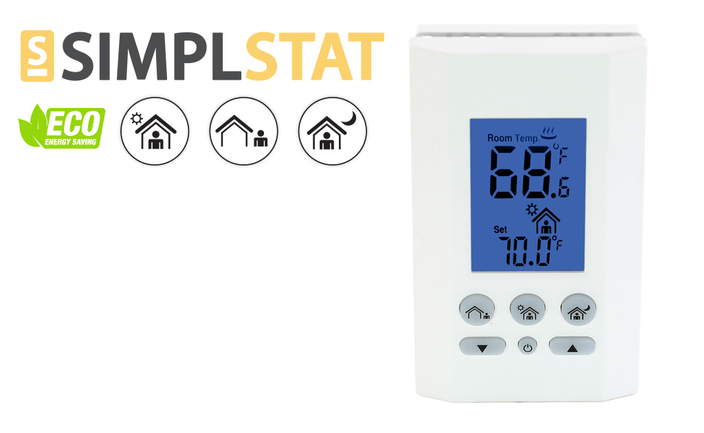 The SimplStat Electronic Thermostat with Personalized Presets. No Programming Required. Featuring a user-friendly interface of 3 oversized, back-lit preset temperature buttons that can be personalized (Home / Away / Sleep). Simply press the custom comfort preset button that applies and have confidence that the room will reach optimal temperature within minutes. Combining industry leading temperature sensing technology with a modern sleek design, King’s K700E series achieves lower energy consumption with higher comfort levels by reducing temperature swings as compared to economy models.