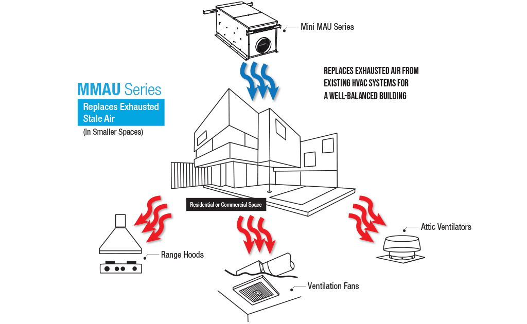 Today’s airtight homes and offices beg for fresh air. Stale and humid air must be replaced by fresh air. During winter, the incoming fresh air is at too low a temperature to be comfortable and the Mini Make Up Air MMAU Series preheats the incoming air to your preset temperature.