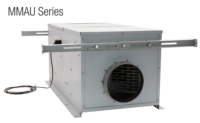 The King Mini Make-Up Air Unit MMAU Series is designed to “make up” the air in your interior space that has been removed due to process exhaust fans. The building ventilation and the make-up air system work together to ensure the building pressure is maintained, while eliminating temperature fluctuations and a number of air quality issues. The Mini MAU preheats the incoming fresh air at the lowest cost, thus continuously providing comfortable ventilation throughout the building. Featuring a backwards-curve centrifugal blower, the MMAU combines a fan driven fully modulating electric heating unit with a fresh air relay logic control circuit providing an extremely versatile all-in-one packaged unit.