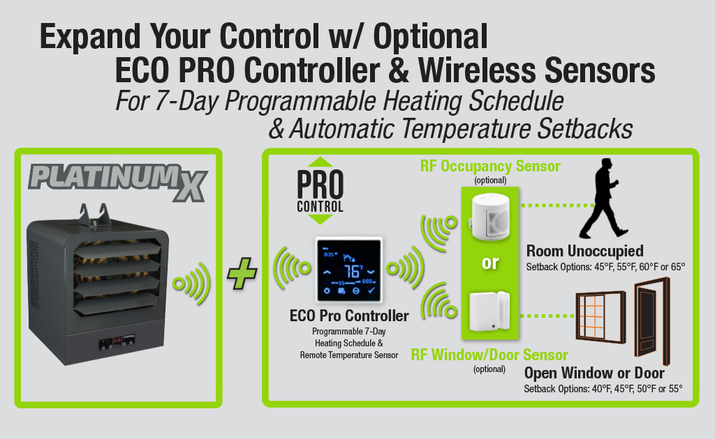 The optional ECO PRO Controller is also compatible with optional wireless RF window/door and occupancy sensors, automatically setting back temperatures when windows are open or when the room is unoccupied.
