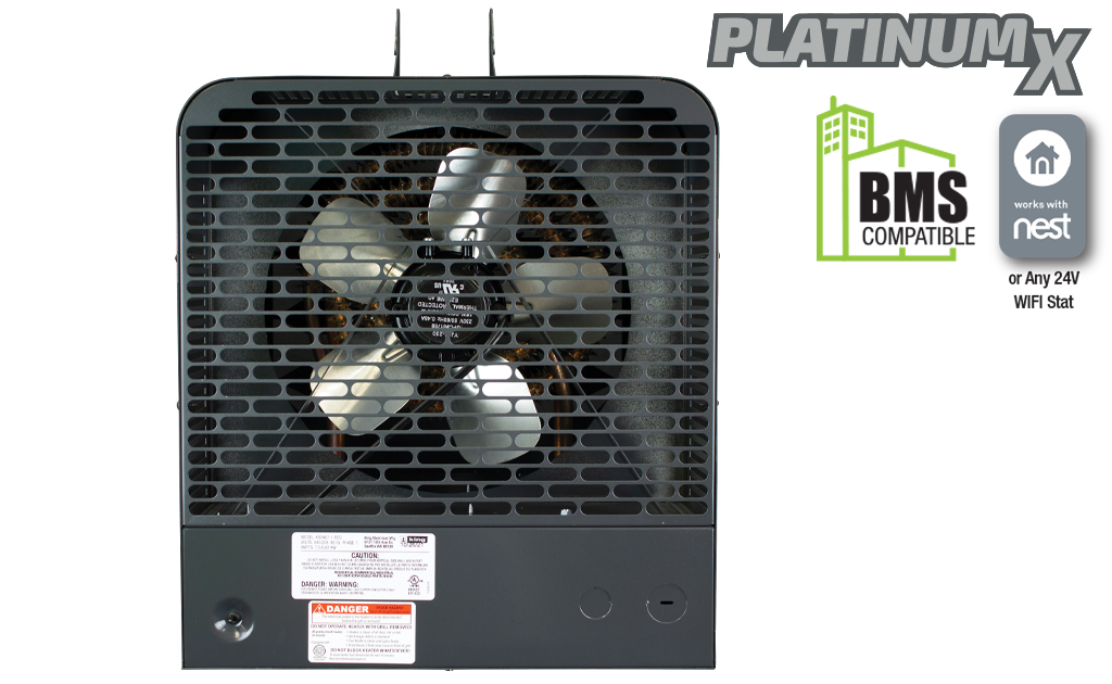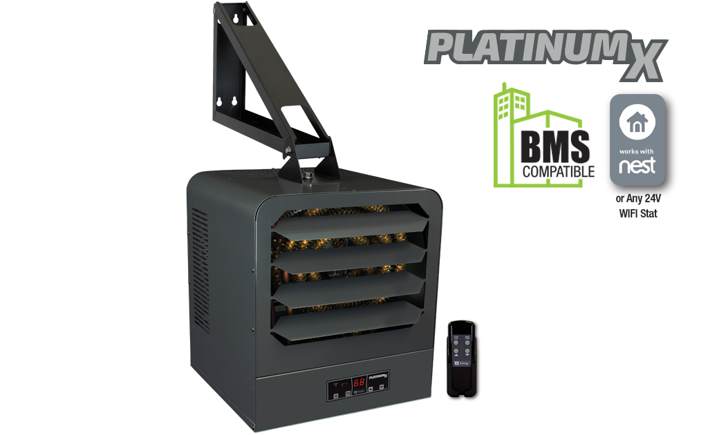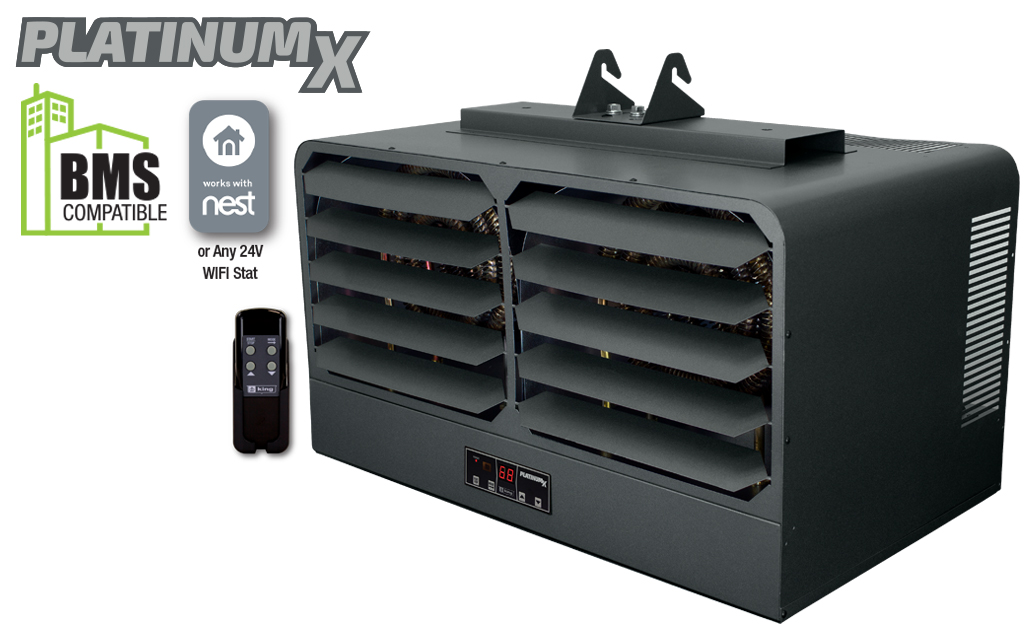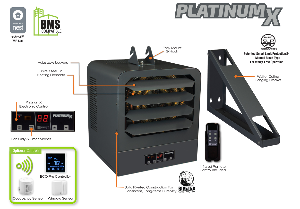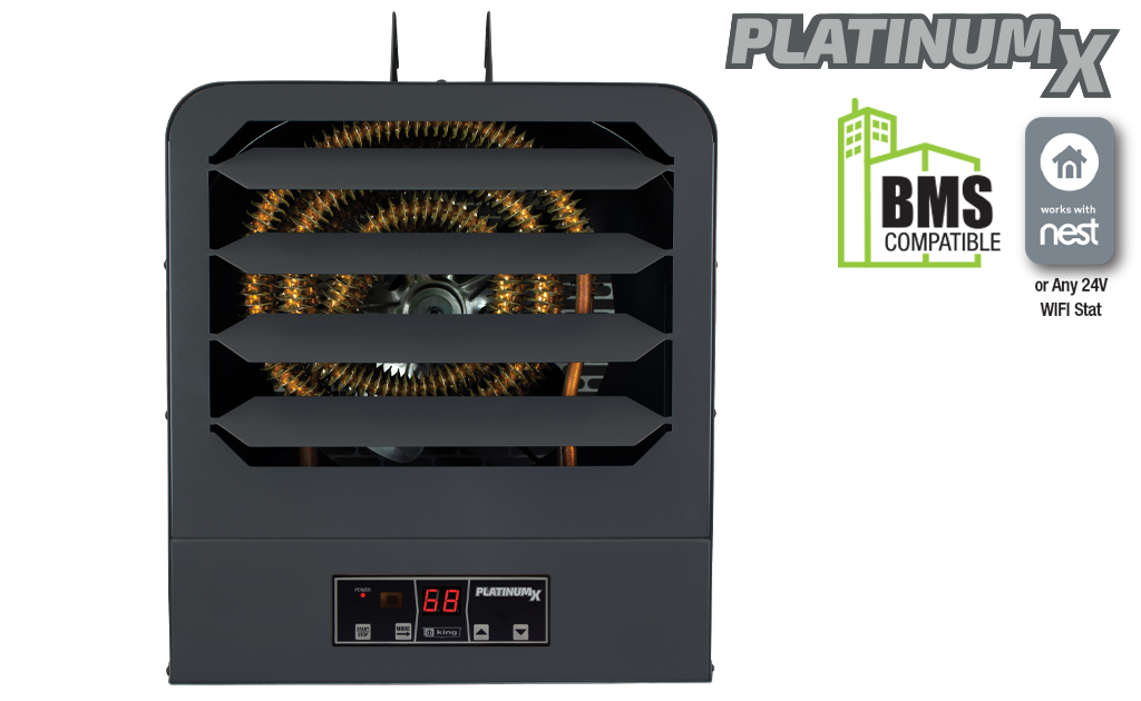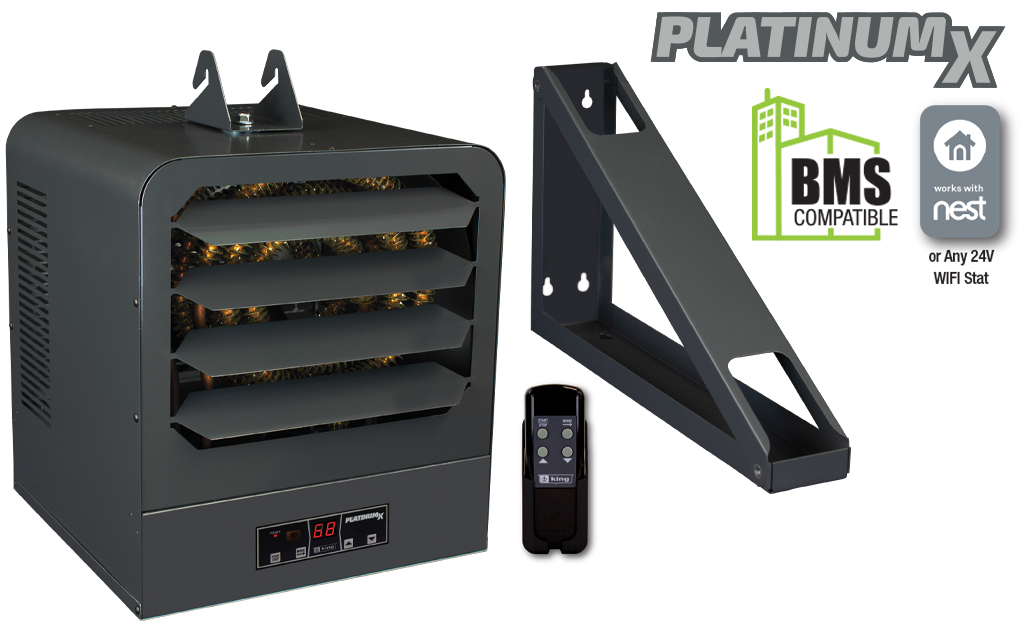 King’s KB PlatinumX BMS series unit heaters are the most full-featured unit heaters on the market, with in-built electronic thermostat for +/- 1°F accuracy and remote control for simple operation. Comes standard with a provision for adding an optional 24V thermostat for remote temperature control, making it compatible with Nest Thermostats or Building Management System Integration. Includes integrated summer fan only and thermostat timer modes, the KB PlatinumX has you covered.