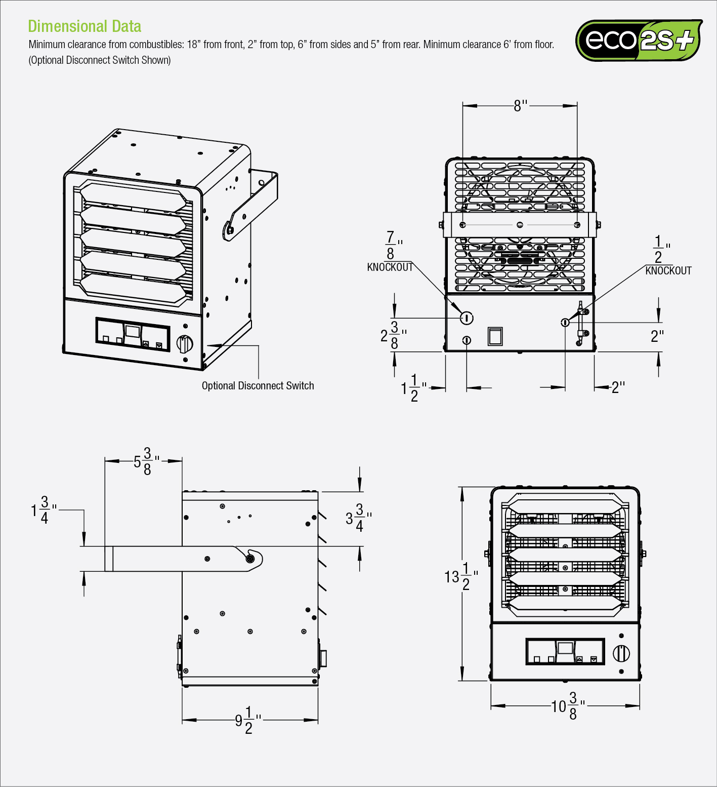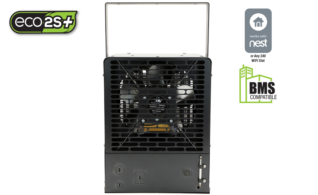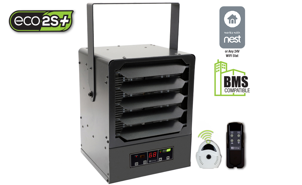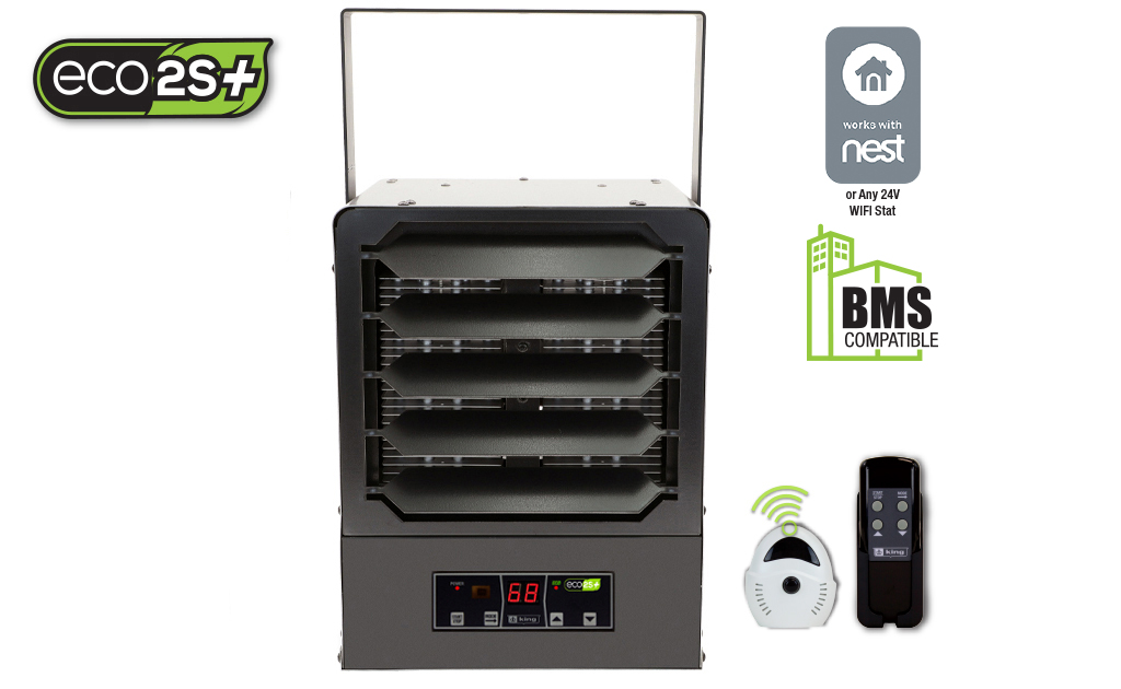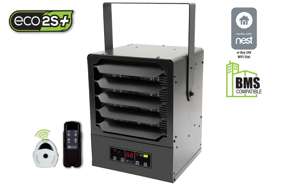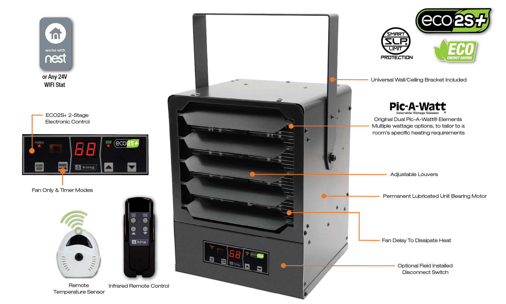 The KBP ECO2S+ series compact unit heater delivers exceptional performance, energy efficiency, and user control, featuring King’s innovative built-in ECO2S+ electronic thermostat with remote control. The heaters provide energy-efficient 2-stage heating, an Eco mode that automatically uses the lowest wattage needed, integrated fan-only and timer modes, and a convenient remote for simple operation.