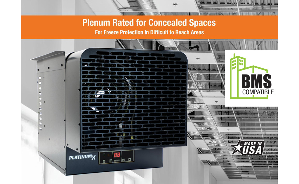 KBU PlatinumX is a zero-clearance plenum-rated freeze-protection heater approved for use in concealed areas of buildings such as an area between a finished ceiling and drop ceiling or in an open plenum. KBU PlatinumX fits seamlessly into tight spaces where warmth or freeze protection is required. It is engineered to withstand dirty, dusty, or even mildly corrosive environments, and rated for zero clearance mounting against surfaces.