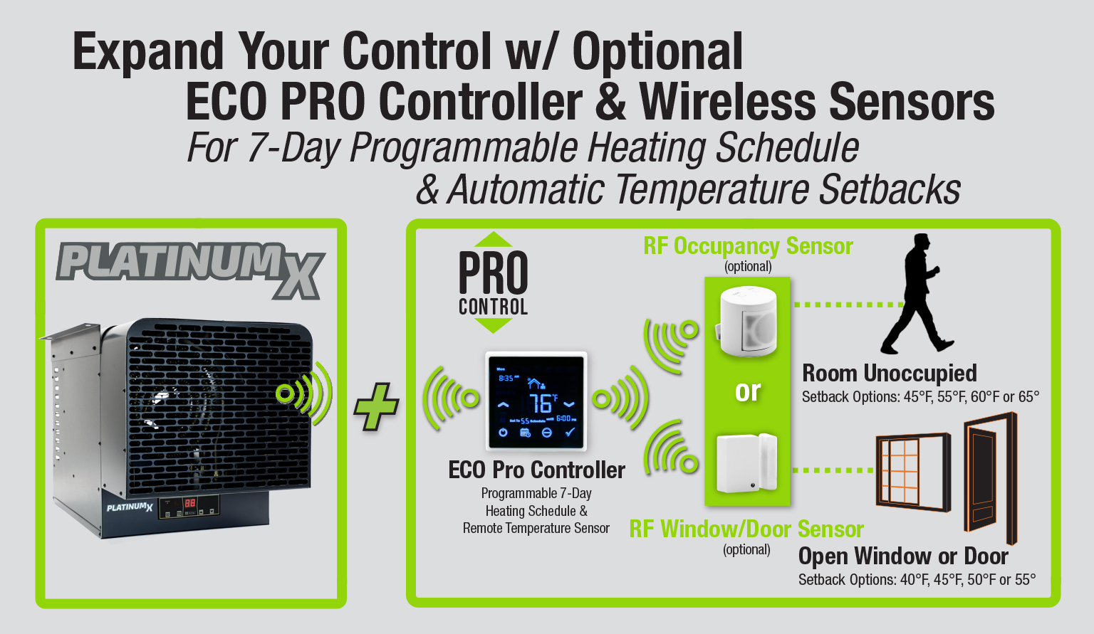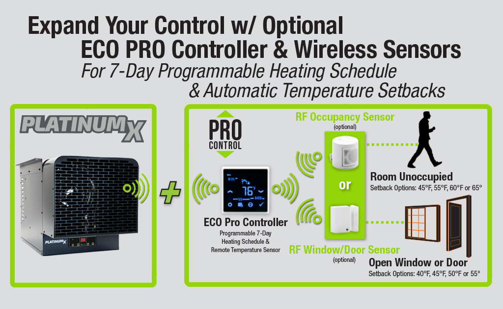 The optional ECO PRO Controller is also compatible with optional wireless RF window/door and occupancy sensors, automatically setting back temperatures when windows are open or when the room is unoccupied.