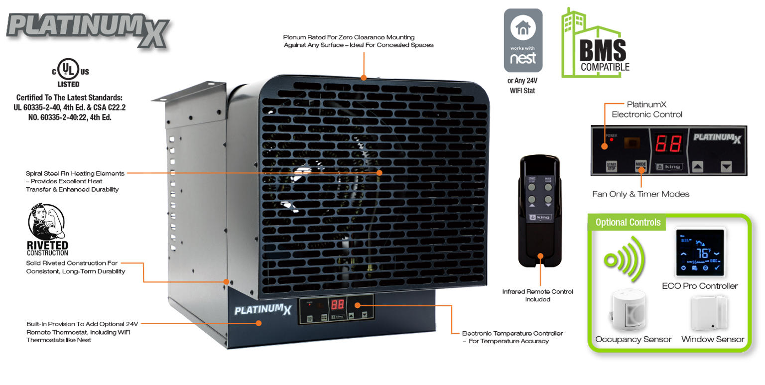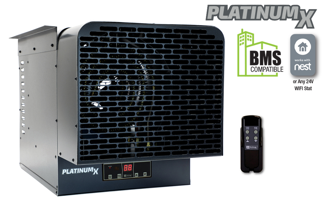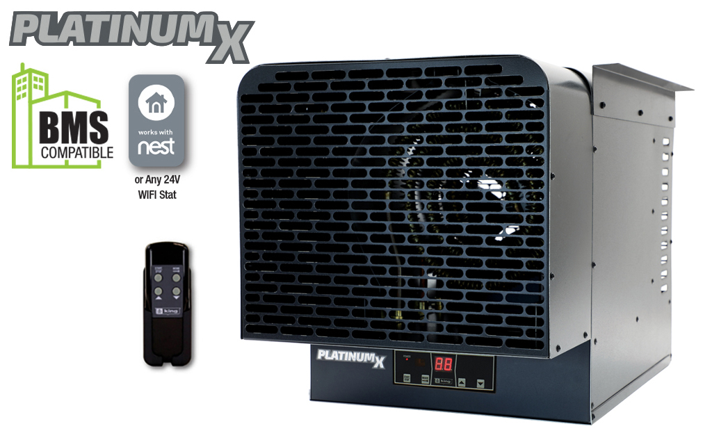 Contractor shall supply and install KBU Platinum X BMS Series unit heaters manufactured by King Electrical Mfg. Company. Heaters shall be of the wattage and voltage as indicated on the plans.