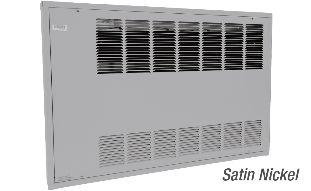 The King heavy-duty KCF cabinet heater can be placed almost anywhere. Typical uses are hall or entryways where a deep cabinet heater would be too intrusive. The slim design is great for schools, office, air terminals, auditoriums, apartments, restaurants, churches, factory’s, theaters and other locations where a clean impact resistant 18 gauge construction and entry way or comfort heating is needed. The KCF uses the time tested ceramic core heating elements that King developed over 50 years ago and have a very long life. Available in a slim 4”surface mount or the recess in wall installation. A sub-base is available when installing close to the floor to fill the gap. Thermostats, Contactors and Disconnect switches are available as options. Textured powder coated finish in an almond color. KCF model adds quiet tangential fans in the bottom of the cabinet to help move the heated air out of the cabinet.