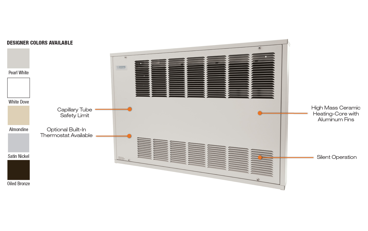 The KCF model adds quiet tangential fans in the bottom of the cabinet to help move the heated air out of the cabinet and circulate it into the room.