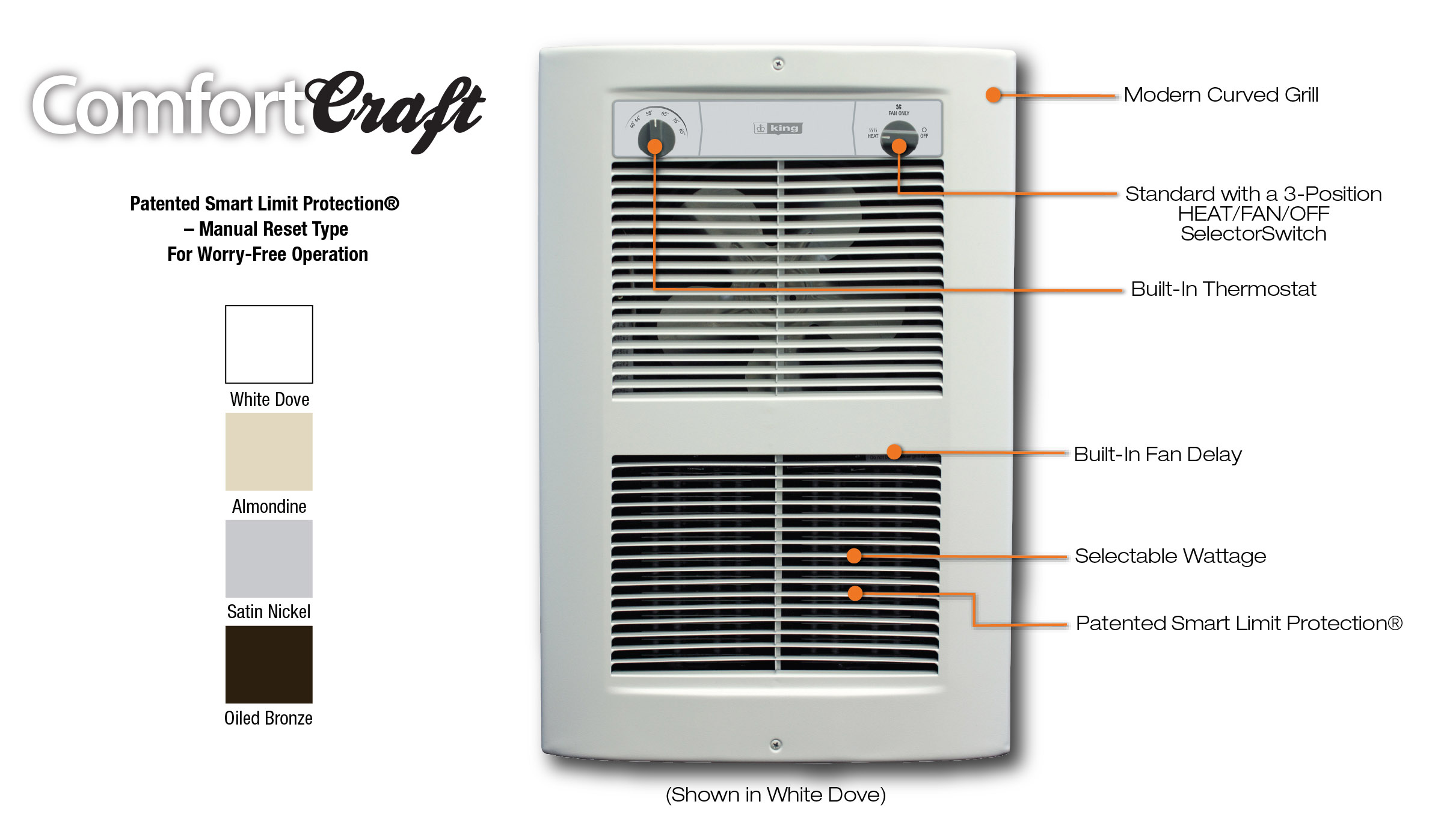King redefines comfort with a sleek and modern new architectural design. Offering higher output than our industry leading PAW heater. King’s exclusive dual Pic-A-Watt steel fin elements allow customers to select from a range of wattage options, tailoring the heater to an area’s specific heating requirements. With up to 4500W, this is our most popular large wall heater, used in both residential and commercial applications. Standard with a 3-position Heat/Fan/OFF-DISCONNECT Switch and a fan delay to help dissipate heat from the high-mass steel plate fin elements thereby prolonging heater life and increasing energy efficiency. The high quality built-in thermostat has degrees on the label so temperature selection is easy and accurate. Now Available in 4 design colors to match any decor: White Dove, Oiled Bronze, Satin Nickel and Almondine.