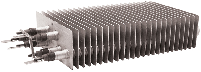 Elements: Element assemblies shall consist of three steel sheathed heating tubes in a furnace-brazed, plate-finned, block design. Each sheathed tube shall contain coiled Ni-Chrome wire embedded in an insulator of Magnesium Oxide. The element assembly shall provide up to seven (7) possible wattage configurations available for selection during field installation. The use of external resistors, diodes, or other weak links to obtain multiple wattages will not be acceptable.