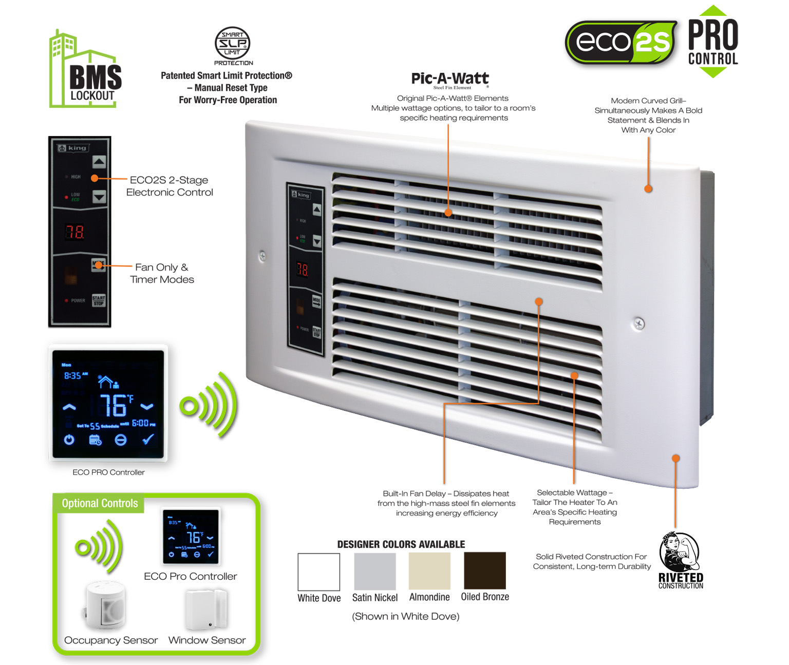 The ECO PRO Remote Thermostat, equipped with an integrated temperature sensor, can be placed anywhere in the room to eliminate cold spots and ensure precise temperature control exactly where it’s needed. Additional smart features include summer fan-only and timer modes, remote temperature adjustments, and King’s exclusive Pic-A-Watt heating element, allowing installers to easily select the ideal wattage during setup. An integrated BMS lockout circuit enables seamless integration with Building Management Systems, preventing the heater from operating during cooling cycles.