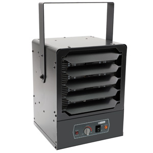 The SKB compact heavy duty unit heater is designed for use as primary or supplemental heat sources in large or exposed areas, including commercial stores, workshops, barns, storage shed and garages to prevent freezing. Spiral finned steel elements and high air volume (CFM) ensure efficient heat exchange producing cooler element operation, prolonging heater life. By combining the highest quality components with a dynamically balanced fan blade, the SKB unit heater will provide years of trouble-free service. Includes both a power on indicating light and a red caution light that comes on if the heater stops due to the over temperature limit tripping. A universal wall/ceiling bracket provides for quick and simple installation. The built-in thermostat turns the heater on and off to maintain the desired room temperature.