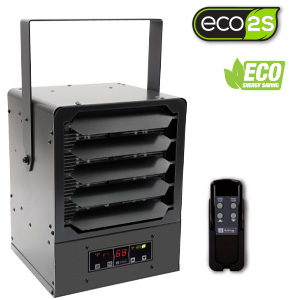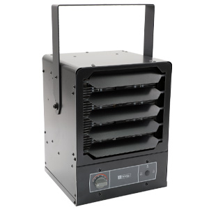 Ceiling or wall mountable, flow through design pulls air from back of heater to efficiently discharge warm air out the front at 385 CFM. Perfect for a garage or shop.