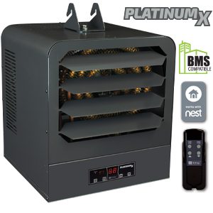 Introducing the most full featured unit heater ever built, improved by the Power of X. Better comfort through better engineering. KB PlatinumX includes it all. Comes standard with a provision for adding an optional 24V thermostat for remote temperature control, making it compatible with Nest Thermostats. With electronic thermostat and IR remote control.